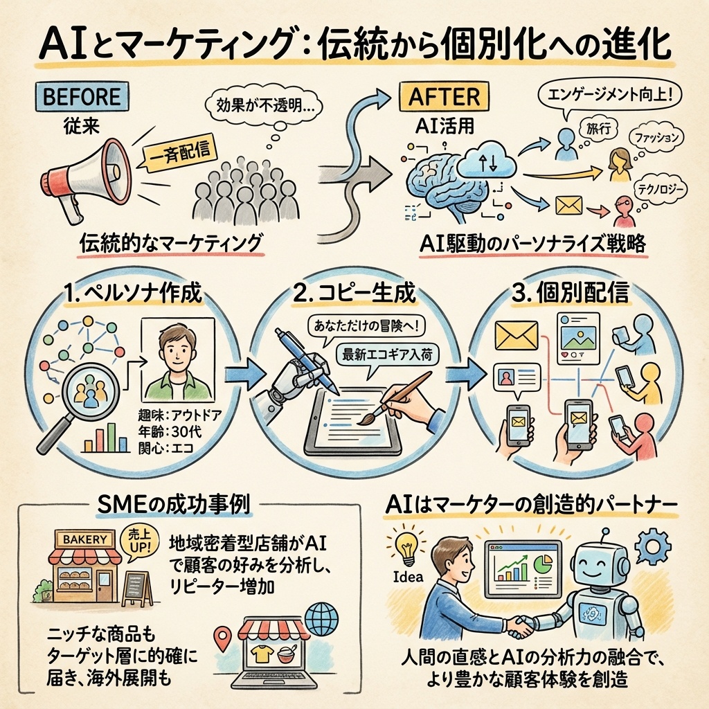 従来のマーケティングは、拡声器のように「一つのメッセージを大勢に届ける」手法でした。しかしAIを活用すると、顧客一人ひとりの隣に寄り添う「パーソナル執事」のように、最適な提案をすることが可能になります。