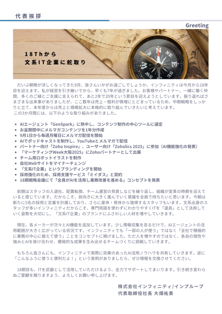 インフィニティは今月から18年目を迎えます。