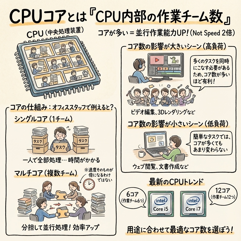 「コアはCPU内の作業チーム数です。4コアなら4つの作業を同時処理できますが、倍のコア数が倍の速度を意味するわけではありません。複数ソフトの同時利用や動画処理では威力を発揮しますが、単純な事務作業なら4コアで十分なんです。」