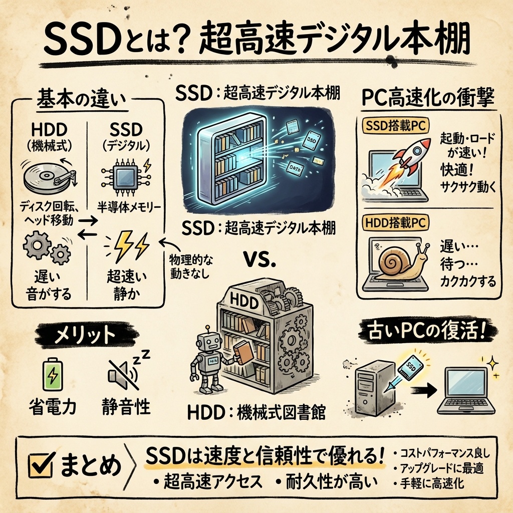 「SSDは従来のHDDと違い、機械的動作なしでデータを読み書きする高速ストレージです。アナログ図書館からデジタル図書館への進化と同じで、データアクセスが5-30倍高速化。古いPCでも、SSD化で劇的な性能向上が期待できるんです。」
