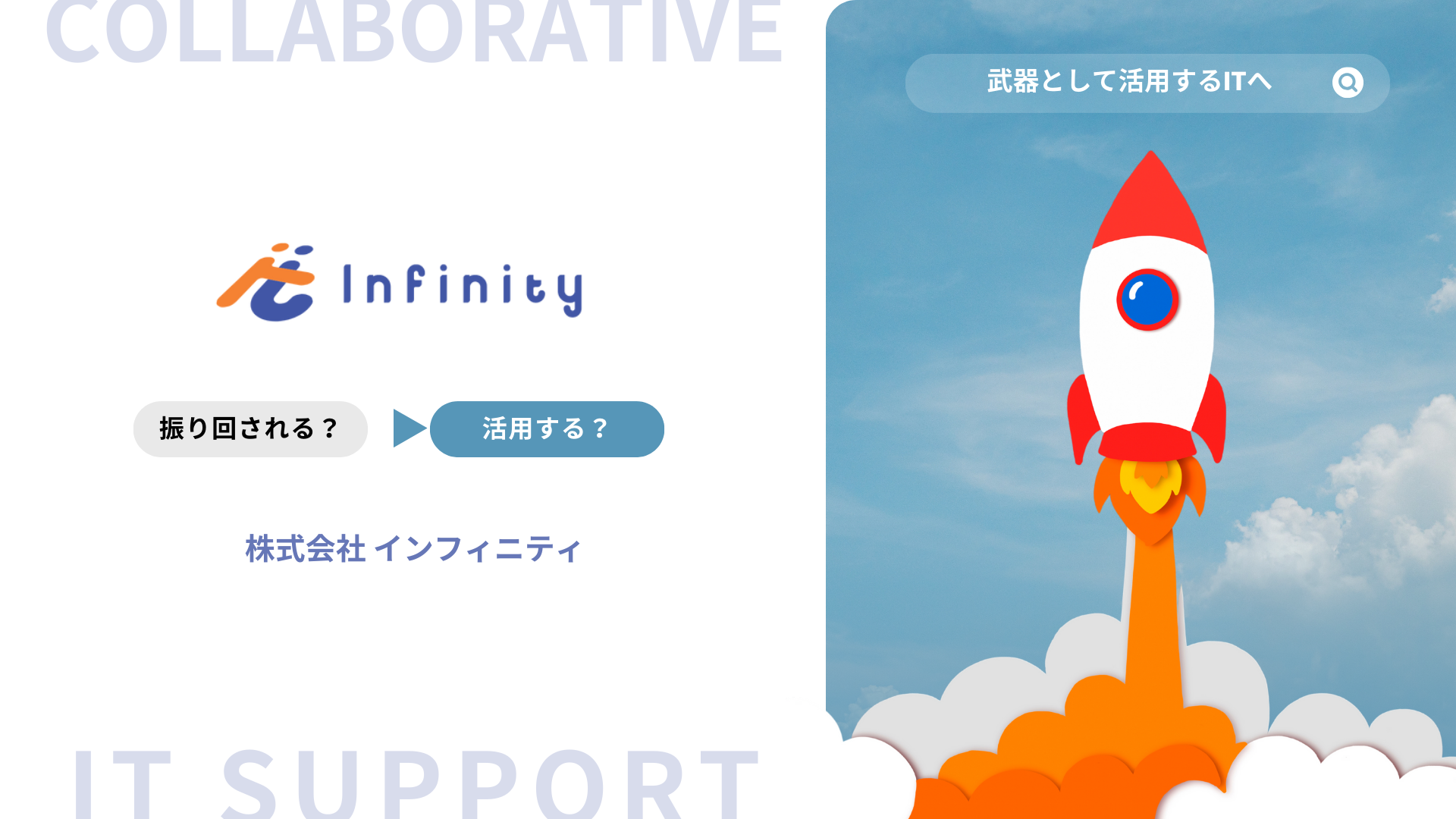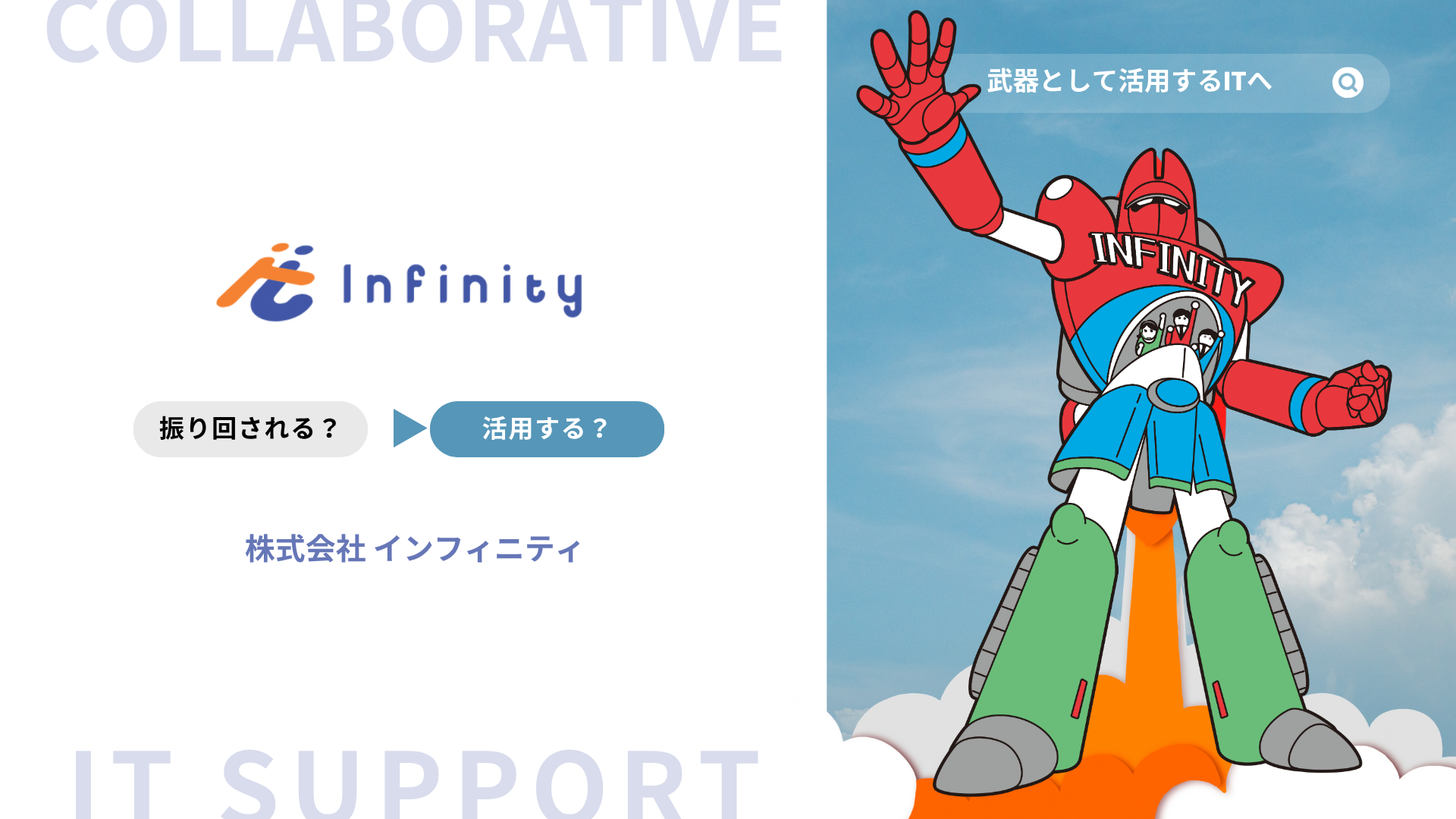 ビジネスを拡げていくためには変革が必要です。現状維持は緩やかに衰退していくこと。インフィニティでは、ITを道具として活用し、仕事が加速するIT環境構築をサポートしています。