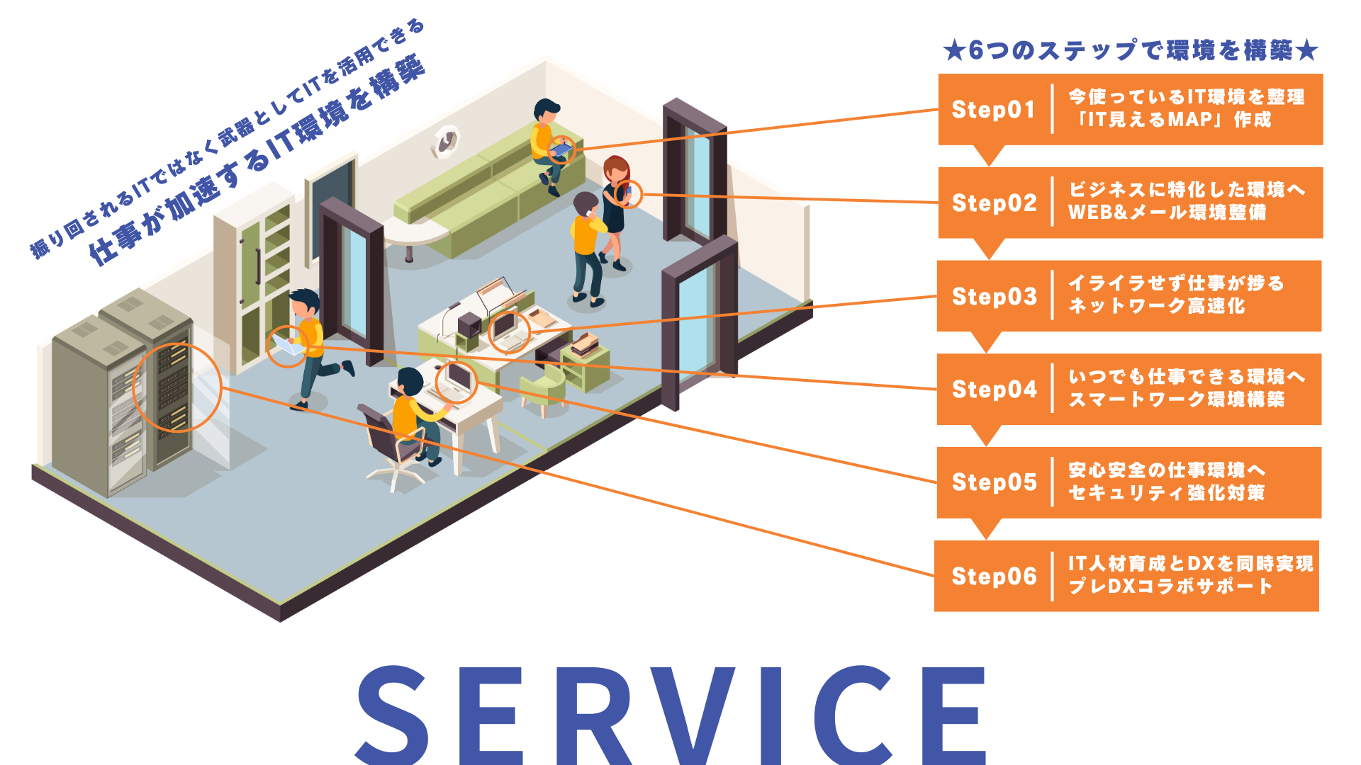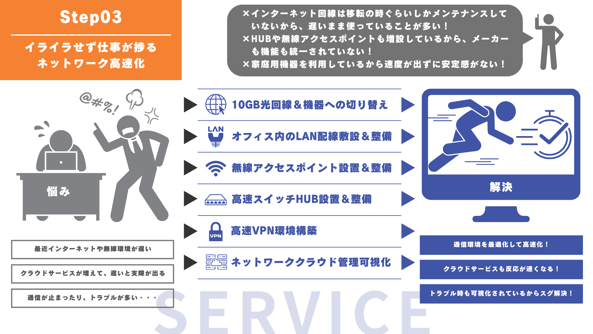 3つ目のステップは、ネットワークの高速化。クラウドサービスの利用が増える中、通信環境はビジネススピードに直結します。速度が速くなれば、それだけ業務改善になるんです。現状のネットワーク環境を調査して、最適な高速化を提案します。