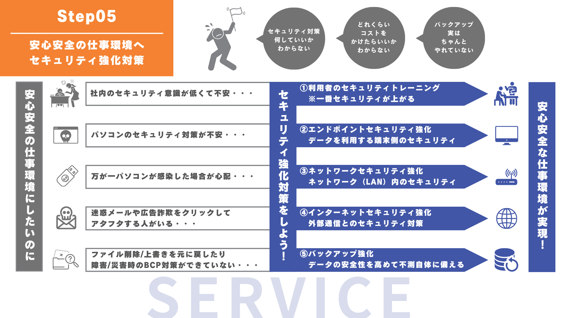 ITが便利になればなるほど、セキュリティリスクも高まっています。でも企業としてどんなセキュリティ対策をすればいいか、迷子になっていませんか?高価なツールを導入するのは簡単です。ですが、高価であれば効果がでるワケではありません。貴社の環境に合った適切なセキュリティ対策をご提案します。