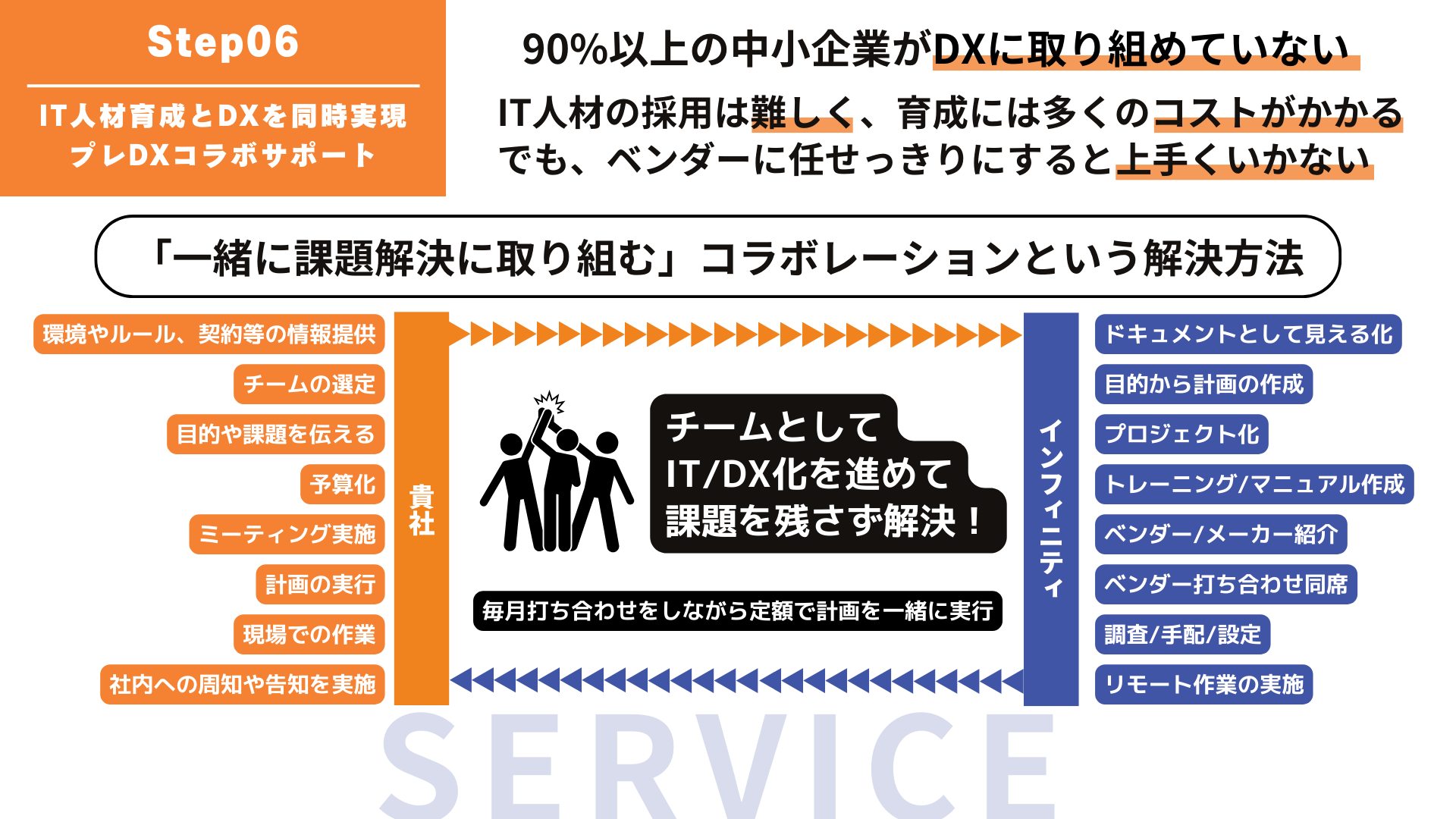 ITを道具として使いこなすためには、社内にノウハウが必要になります。しかし、IT人材の採用は難しく、ベンダーに任せっきりにするのも上手くはいきません。インフィニティでは、伴走型で一緒にチームとして取り組むことで、IT改善とプロジェクト進行、社内担当者のトレーニングを同時に実現していきます。