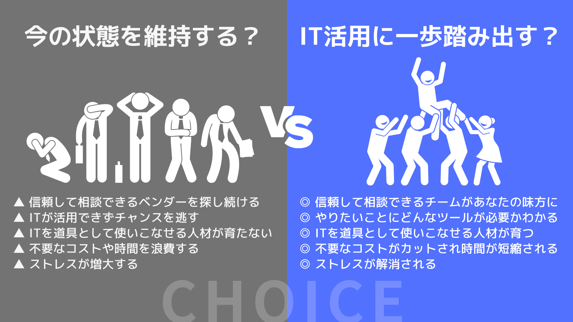 今の状態を維持することは簡単です。もし、貴社がIT活用に一歩踏み出すタイミングが今ならば、私達は全力でサポートします。